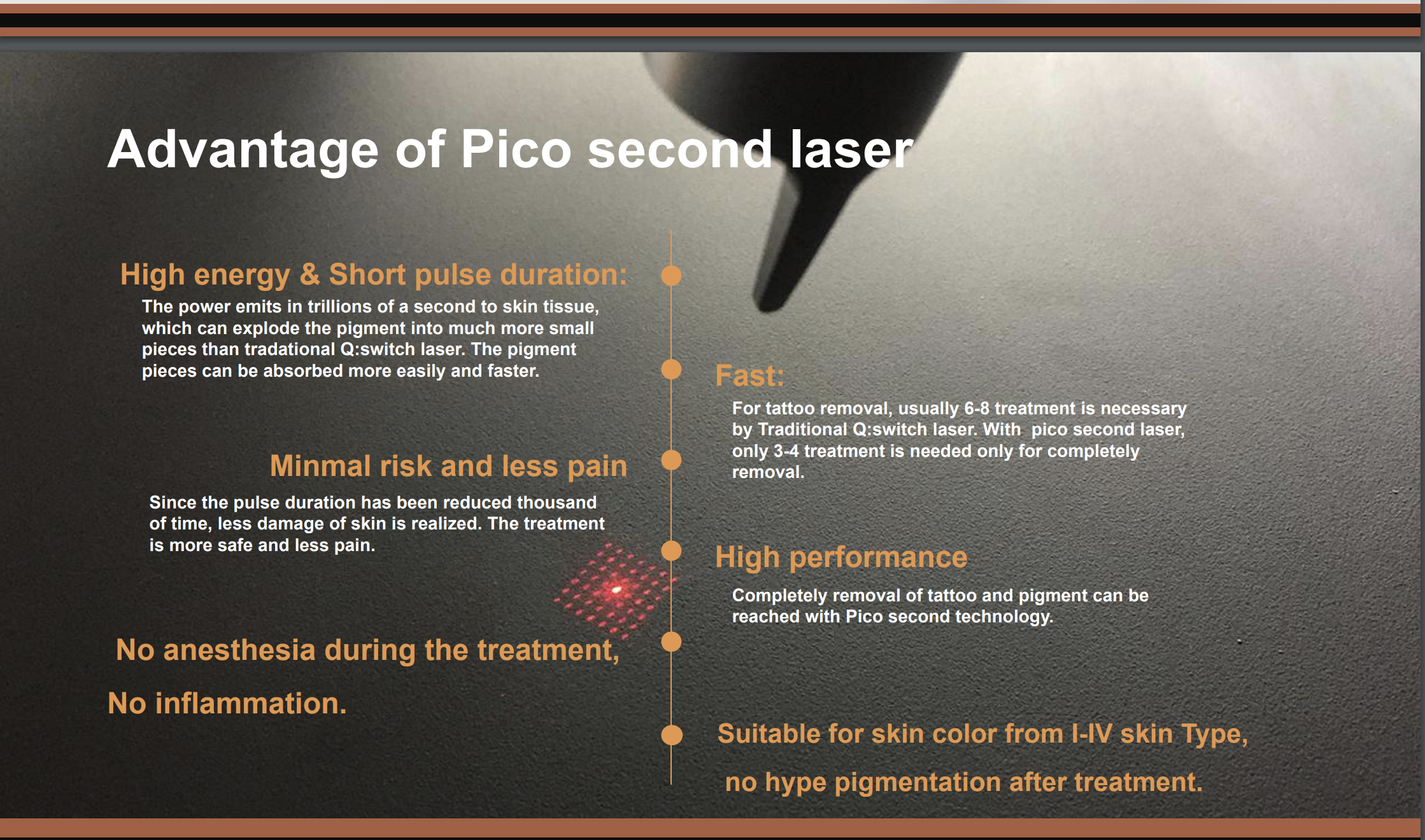 Pico second laser can convert laser energy into gentle pressure to create new collagen by squeezing cells and activating the natural cell without burning or damaging the skin.