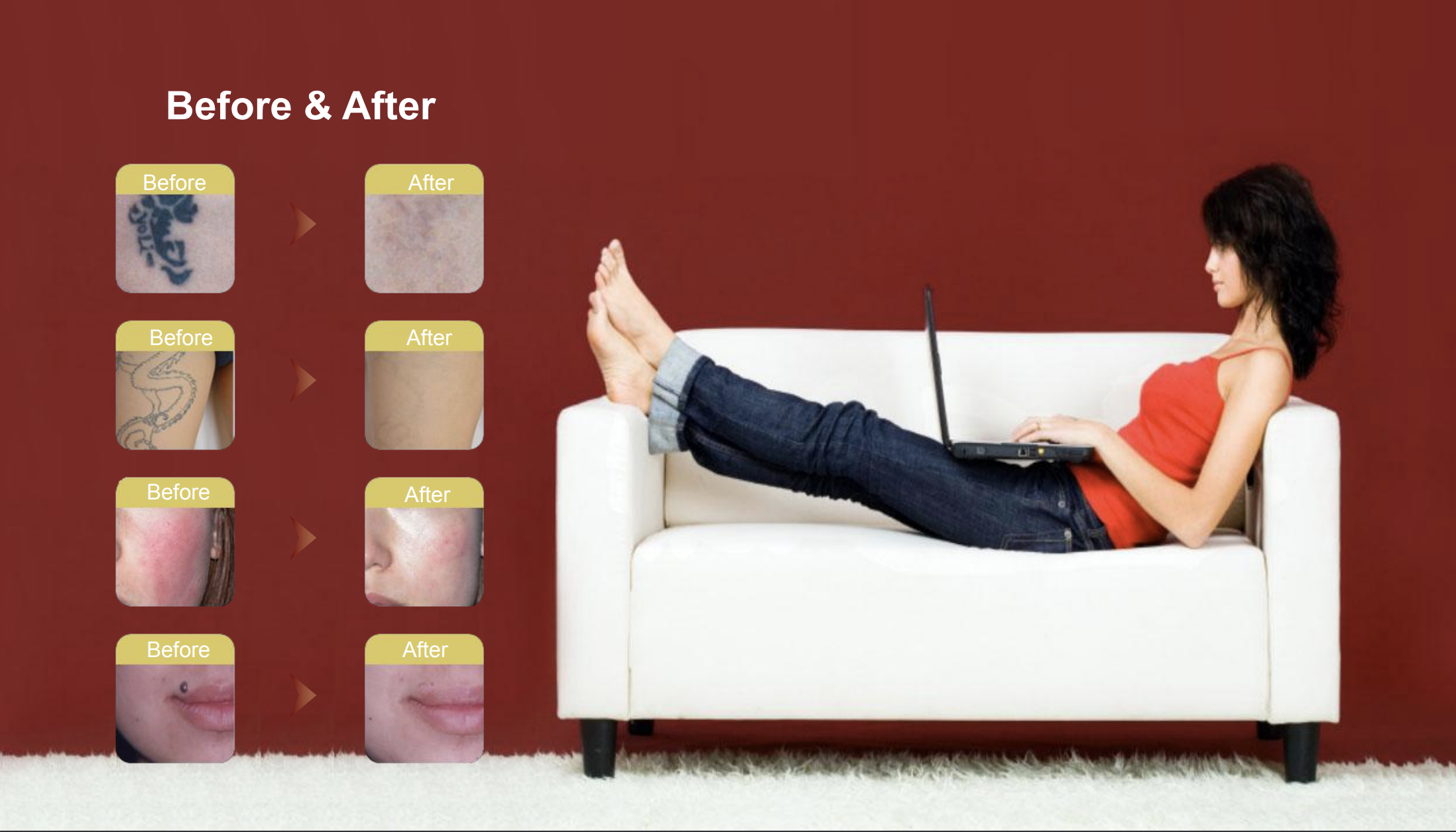 Through trillions of a second and powerful laser energy to grind the pigment in the skin tissue to reach the result of completely tattoo removal and pigment in all type of skin color.